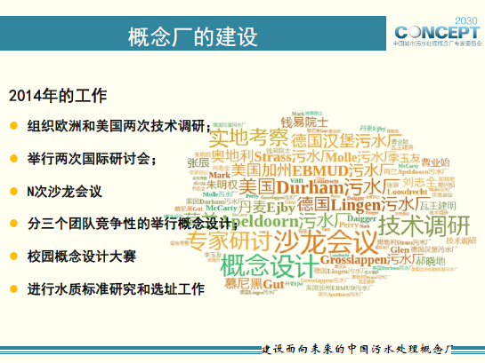 今年,我們將組織兩次出國技術考察,深度調(diào)研10個以上的歐洲先進污水處理廠,并開展兩次國際研討會,三次內(nèi)部技術沙龍,也將同步開展水質(zhì)標準廠址選擇的工作。針對概念設計部分,我們將分為由俞漢青教授、王洪臣教授以及我組成的三個團隊進行獨立的、競爭性的“概念廠”設計工作。年底也將舉行“概念廠”校園設計大賽。