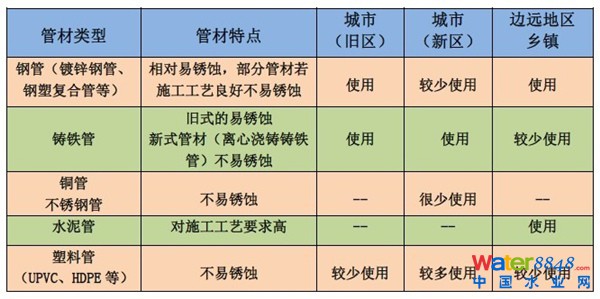 從全國范圍來看, 管材是各種各樣五花八門。從相對易銹蝕的鋼管(鍍鋅鋼管, 鋼塑復合管等)、舊式鑄鐵管,到不易銹蝕的銅管、不銹鋼管乃至塑料管,在城市舊區(qū)、新區(qū),以及鄉(xiāng)鎮(zhèn)地區(qū)都有不同的使用情況。