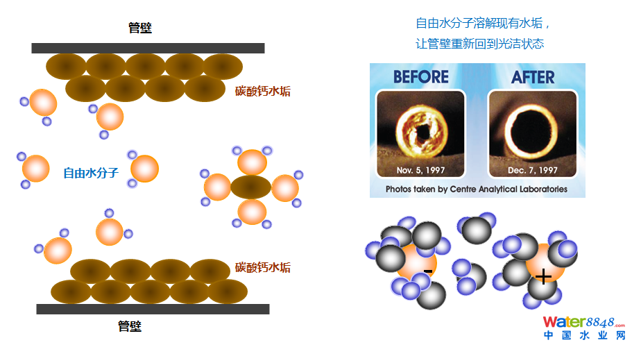 額外的好處: 水垢離子碰撞結(jié)晶,原先離子周?chē)乃肿右矔?huì)被釋放出來(lái),增加自由水分子含量,水的溶解力增強(qiáng) 。