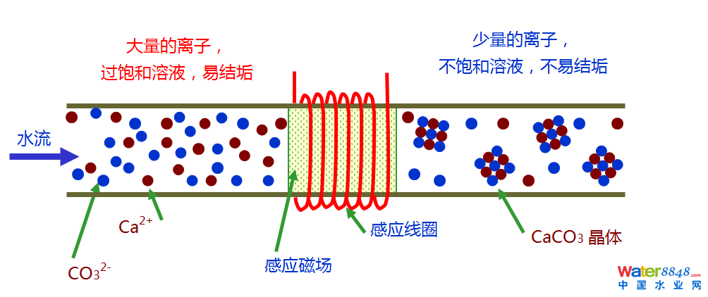 利用纏繞在管路上的線圈產(chǎn)生調(diào)頻感應(yīng)磁場(chǎng),使得水垢離子頻繁碰撞,主動(dòng)結(jié)晶析出,生成納米級(jí)的CaCO3晶體,這種晶體不會(huì)黏附在管壁上,處理后的水垢離子減少,從過(guò)飽和狀態(tài)變成不飽和狀態(tài),從而防止換熱表面結(jié)垢。