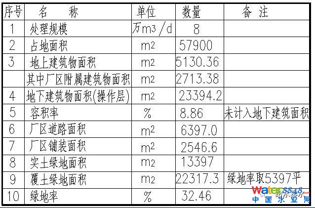 工程為8萬噸處理規(guī)模,占地面積5.79公頃,整個處理廠地下部分地下部分2.66公頃其他為地上部分。整個處理廠地下部分最深的地方埋深在16米,建好的地下部分,地下廠的上面有一米多的覆土,它的整體地方,整個廠的綠化率,如果不算廠的部分是32%的綠化率。
