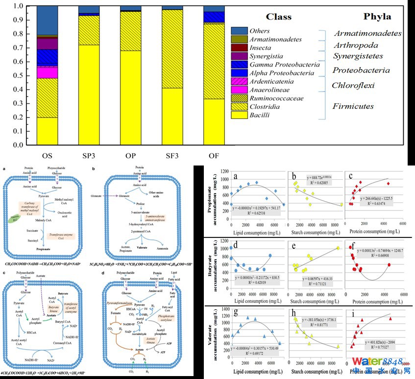 我院劉和教授團(tuán)隊(duì)多年來從事污泥厭氧發(fā)酵定向產(chǎn)酸的技術(shù)、工藝和基礎(chǔ)理論研究。近日,該團(tuán)隊(duì)報(bào)道了城市污泥厭氧發(fā)酵過程中,復(fù)雜的有機(jī)底物是如何影響反應(yīng)器內(nèi)微生物優(yōu)勢種群的構(gòu)成、代謝途徑的切換以及底物中蛋白質(zhì)、脂類、多糖的組成和厭氧發(fā)酵后的末端產(chǎn)物組成的關(guān)系。結(jié)果表明,有機(jī)底物中的蛋白質(zhì)、脂類和多糖無論何種組成比例,乙酸均為第一優(yōu)勢脂肪酸。但是在蛋白質(zhì)豐富的情況下,丙酸和戊酸的組成比例明顯上升,而底物中淀粉、糖類豐富的條件下,丁酸和乙醇比例明顯上升。這是由反應(yīng)器中優(yōu)勢微生物種群以及微生物體內(nèi)的代謝途徑共同決定的。這一研究結(jié)果對于目前污泥厭氧發(fā)酵領(lǐng)域常見的共發(fā)酵工藝的調(diào)控,即,如何控制共發(fā)酵工藝中發(fā)酵底物的有機(jī)物構(gòu)成,以得到預(yù)期組成的有機(jī)酸末端產(chǎn)物,實(shí)現(xiàn)定向產(chǎn)酸具有重要的理論和工程意義。
