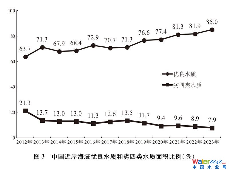 通過深入推進(jìn)重點(diǎn)海域綜合治理、陸海污染協(xié)同防治,持續(xù)建設(shè)美麗海灣,中國近岸海域水質(zhì)總體改善,2023年優(yōu)良水質(zhì)面積比例較2012年高出21.3個百分點(diǎn)。
