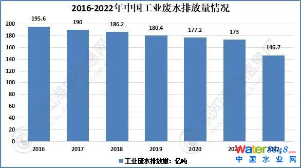 在我國(guó)工業(yè)用水量持續(xù)下降、工業(yè)廢水處理能力和企業(yè)數(shù)量的不斷增加以及工業(yè)廢水再生利用水平的不斷提高下,2010-2022年,我國(guó)對(duì)工業(yè)污染的治理已經(jīng)取得了較大的進(jìn)步,工業(yè)廢水排放量總體上呈下降趨勢(shì)。2022年工業(yè)廢水排放量進(jìn)一步下降為146.7億噸。
