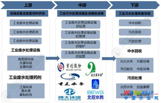 中國(guó)工業(yè)廢水治理產(chǎn)業(yè)鏈結(jié)構(gòu)較為清晰,上游為原材料供應(yīng)及設(shè)備供應(yīng)商,原材料供應(yīng)商包括鋼材、膜材料、化學(xué)制劑、化學(xué)品等。